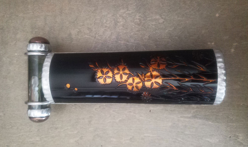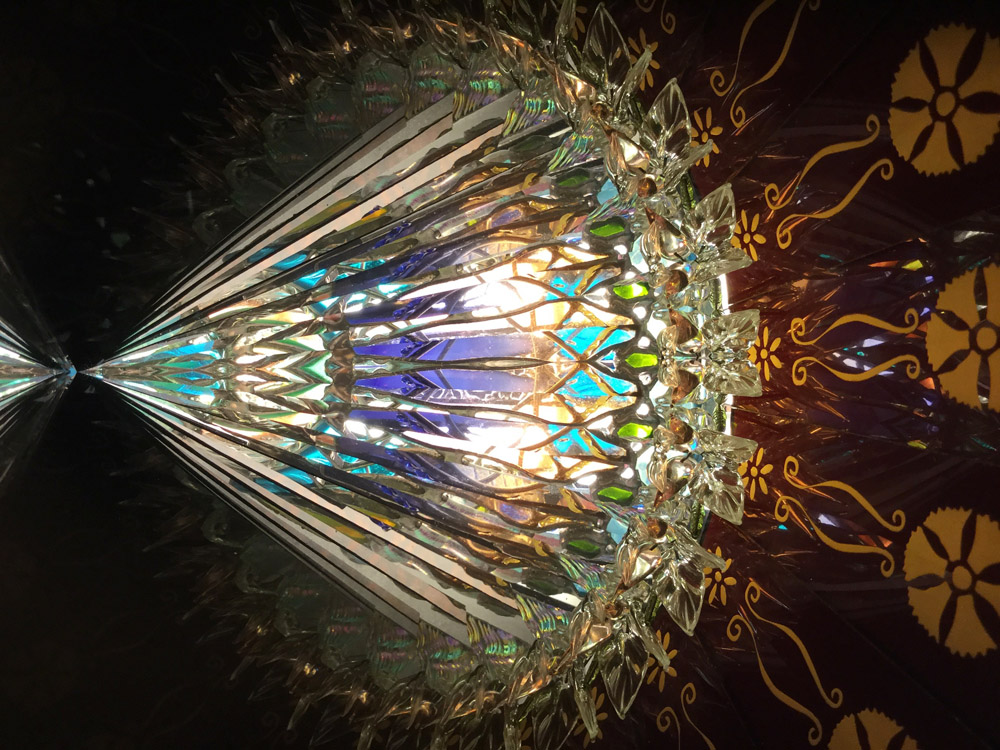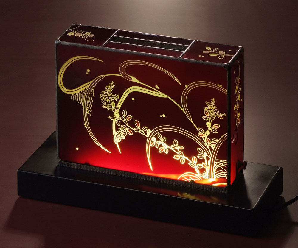 内部の光源に映し出されて模様が浮かび上がり、削り込まれたガラスの黄色の部分が、光を受けて蒔絵の金色の細工のように見えます。