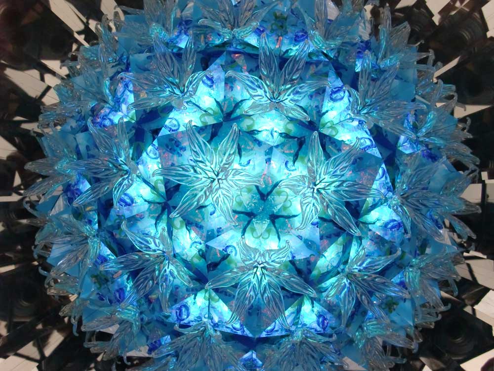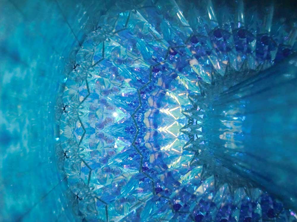 映像の色は柔らかく、引き込まれるような青、グリーン、パープルでソフトにまとめられ、覘くと心が洗われるような色合いです。下からLEDライトを当てて、ブルーやグリーンにオブジェクトが染まります。