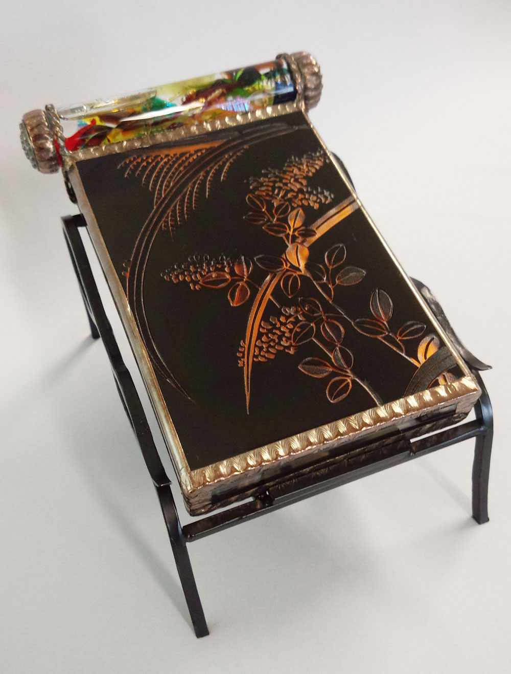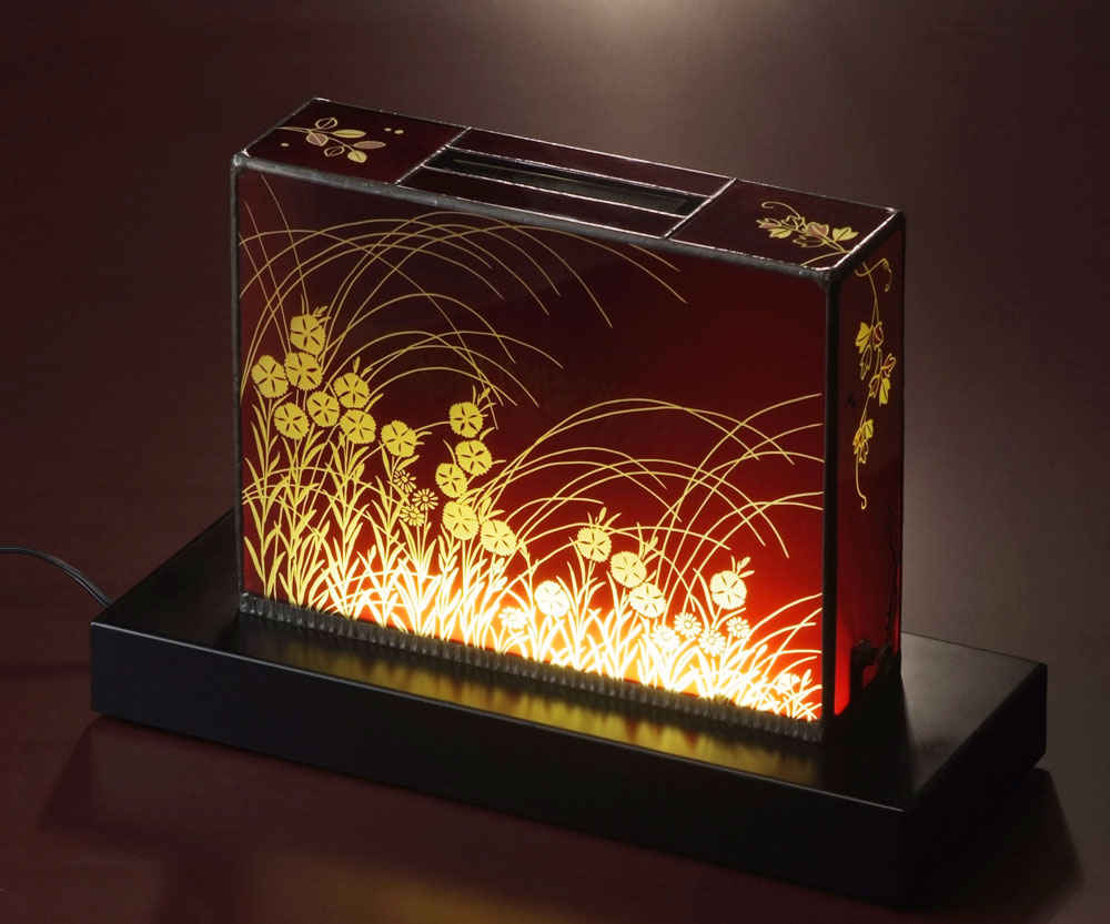 内部の光源に映し出されて模様が浮かび上がり、削り込まれたガラスの黄色の部分が、光を受けて蒔絵の金色の細工のように見えます。