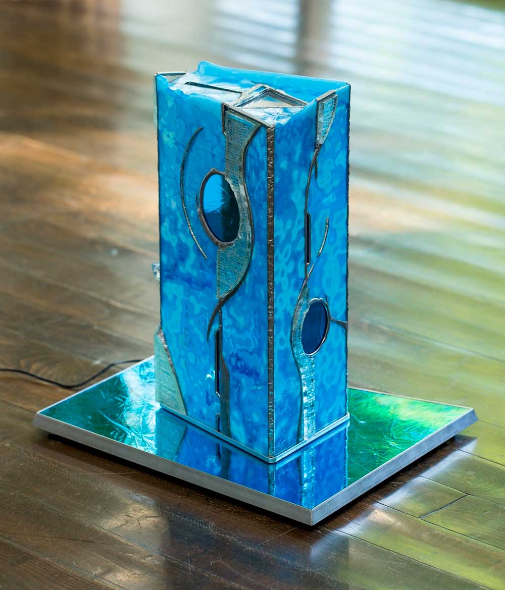 映像の色は柔らかく、引き込まれるような青、グリーン、パープルでソフトにまとめられ、覘くと心が洗われるような色合いです。下からLEDライトを当てて、ブルーやグリーンにオブジェクトが染まります。